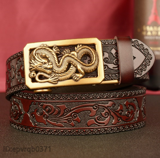 > レザーベルト 新品 オートロック式 バックル 龍ドラゴン 本革 柄物 メンズ ベルト 幅3.5センチ 紳士用 長さ調整可能 /茶