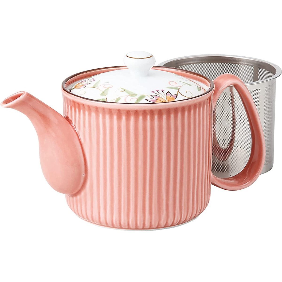 - 蓋に花が手描きされた 軽量 ティーポット 直径10cm 容量470ml 可憐なピンク 使いやすい軽さ目の細かなスーパーステンレス茶こしつき