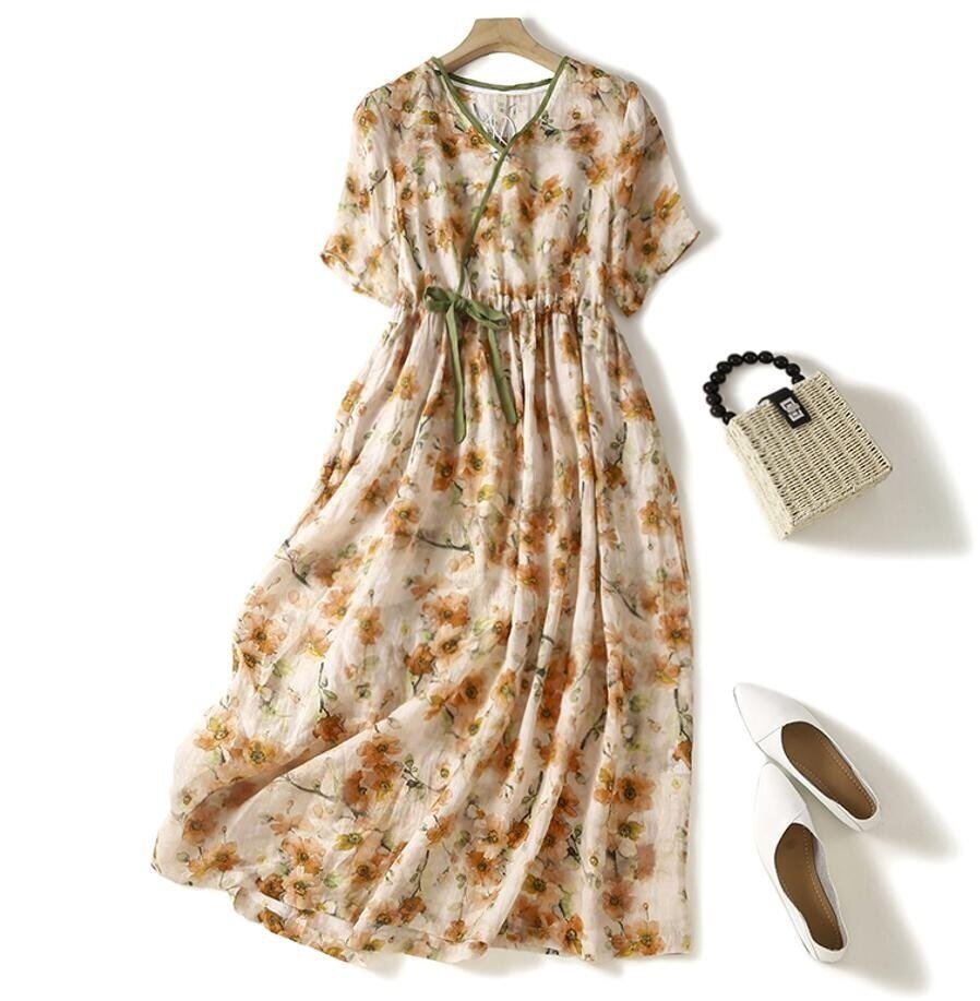 - カジュアル ゆったり きれいめ リネン ワンピース ロングワンピース 綿麻 花柄 プリント 大きいサイズ マキシワンピース 大人K0405