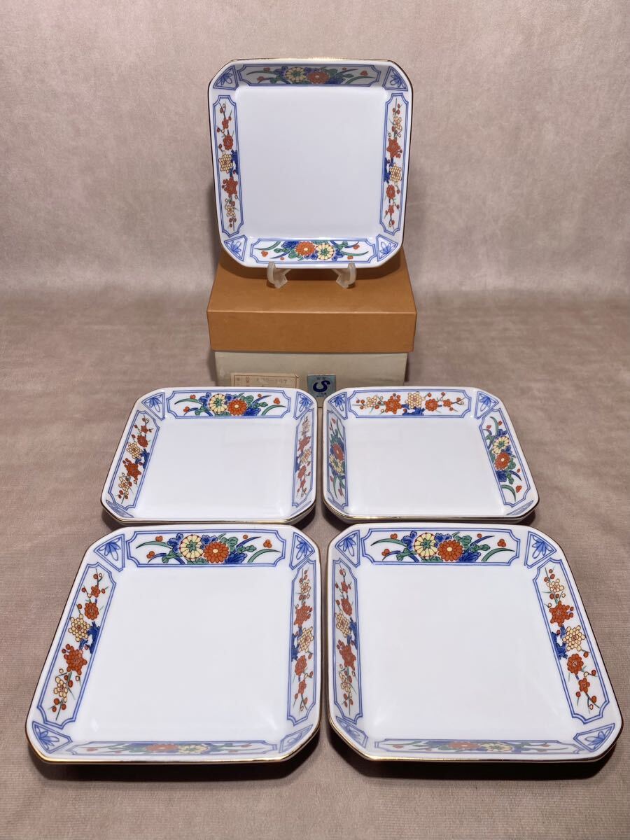 - 新品 未使用 昭和 ビンテージ 角皿 春秋柄 15cm 5枚セット ★ 小皿 中皿 骨董 アンティーク 花柄