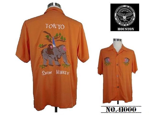 > 【送料無料 35%OFF】HOUSTON ヒューストン 刺繍スーベニアシャツ 「SNOW MONKEY」柄 NO.41000 ORANGE_Lサイズ