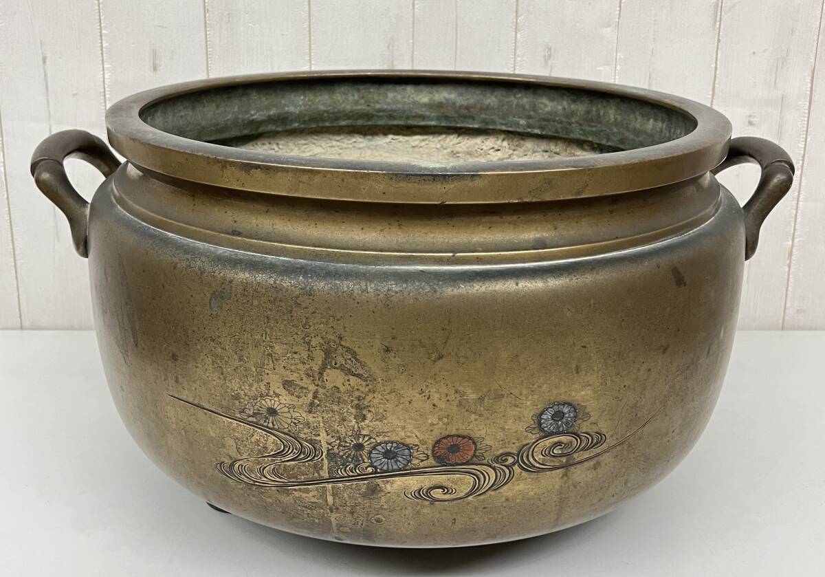 > 伝統工芸 工芸美術 金属工芸 時代物 *色菊文象嵌 流水紋 大火鉢 火鉢 丸火鉢 *銅器 古銅 銅製 重量 10.5㎏ *盛上彫刻 茶道具 骨董