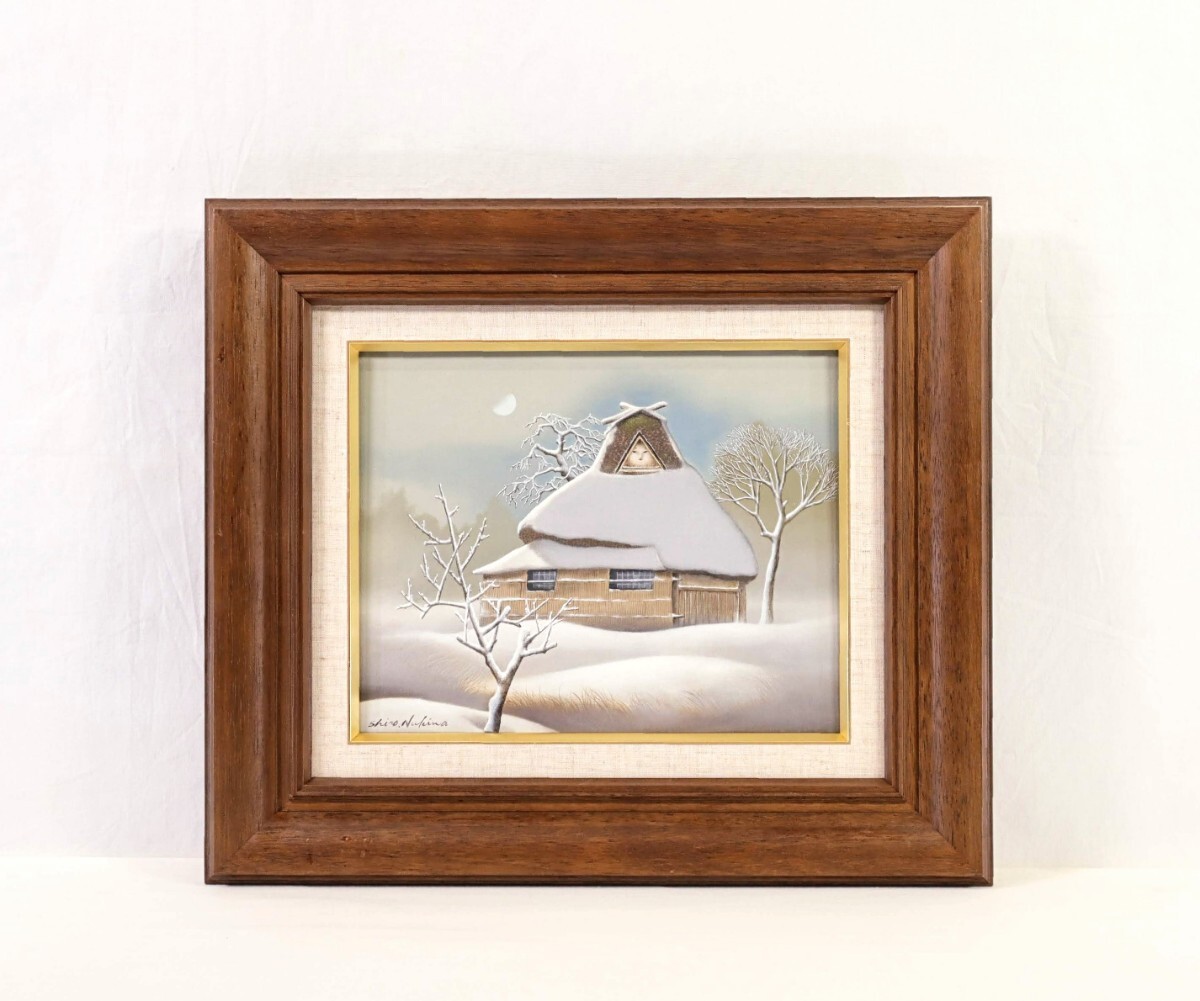 > 真作 貫名獅郎 油彩「雪子の家」画寸 27cm×22cm F3 大阪府出身 無所属 元二科会会員 優しく柔らかい色合いで茅葺き古民家が引き立つ 8987