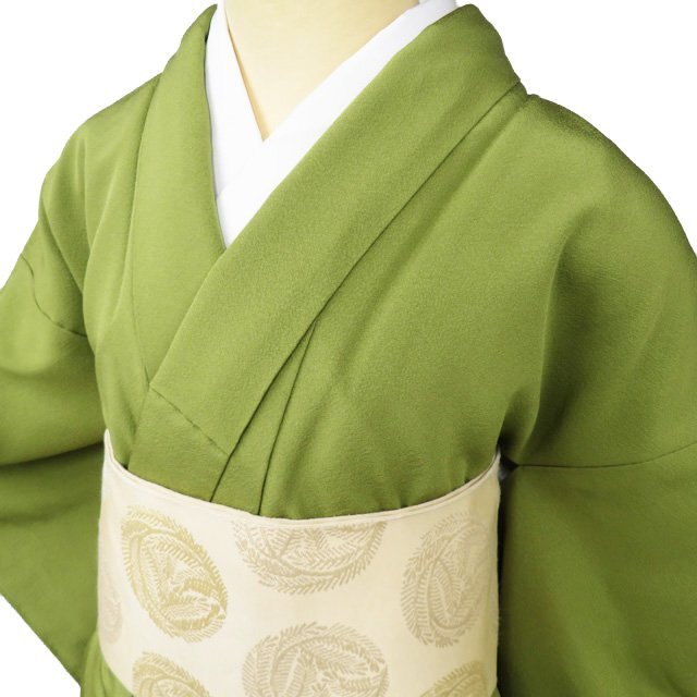 > 色無地 着物 中古 正絹 袷 フォーマル 紋付き 草色 身丈165.5cm 裄65cm L トール きもの北條 A1015-9