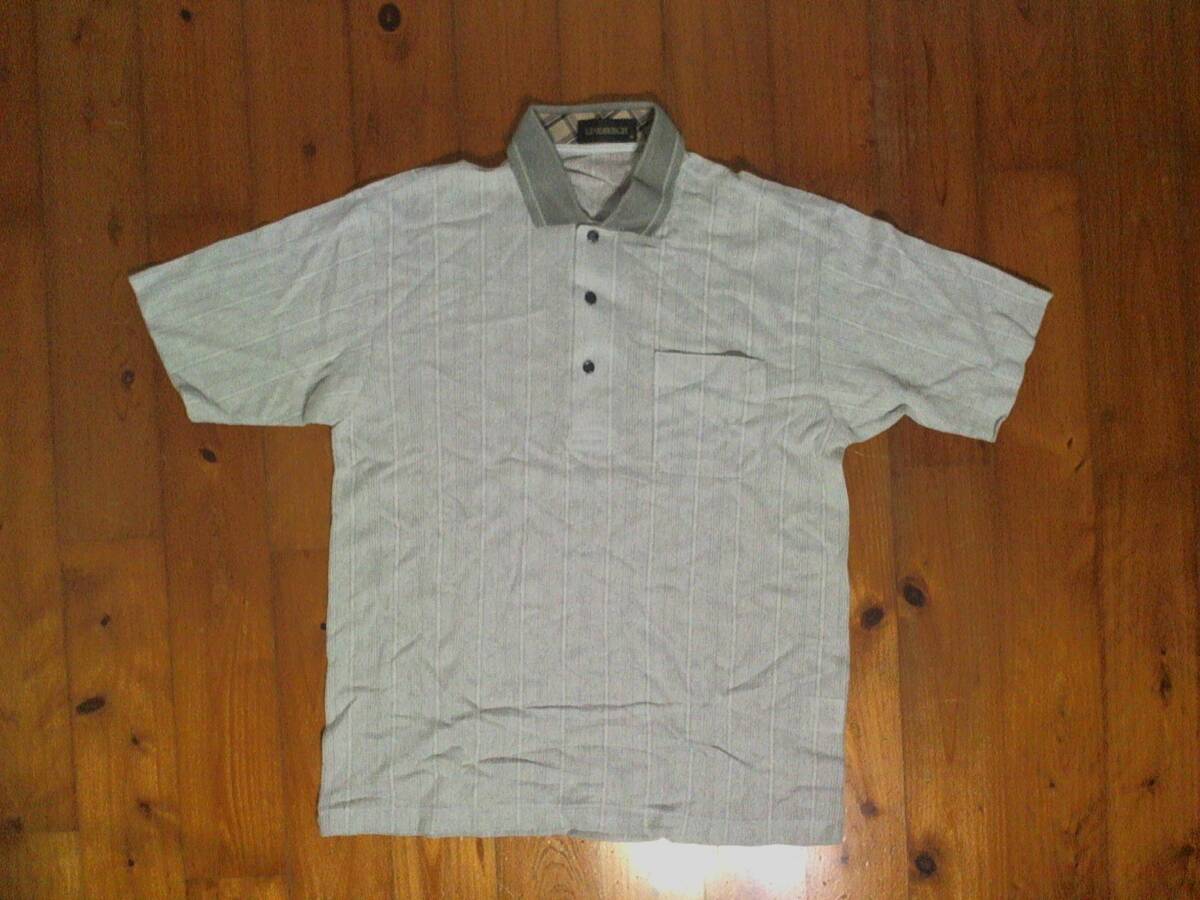 > 松☆国産☆リンドバーグ☆LINDBERGH☆テンセル 麻混 透けニット 半袖ポロシャツ ハーフボタン M 灰色 グレー ストライプ
