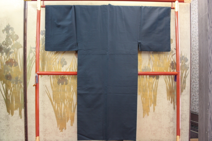 - きもの今昔6972 男の和服 正絹御召袷きもの 鉄グリーン色梨地御召 裏地は金巾濃紺色 身丈139cm
