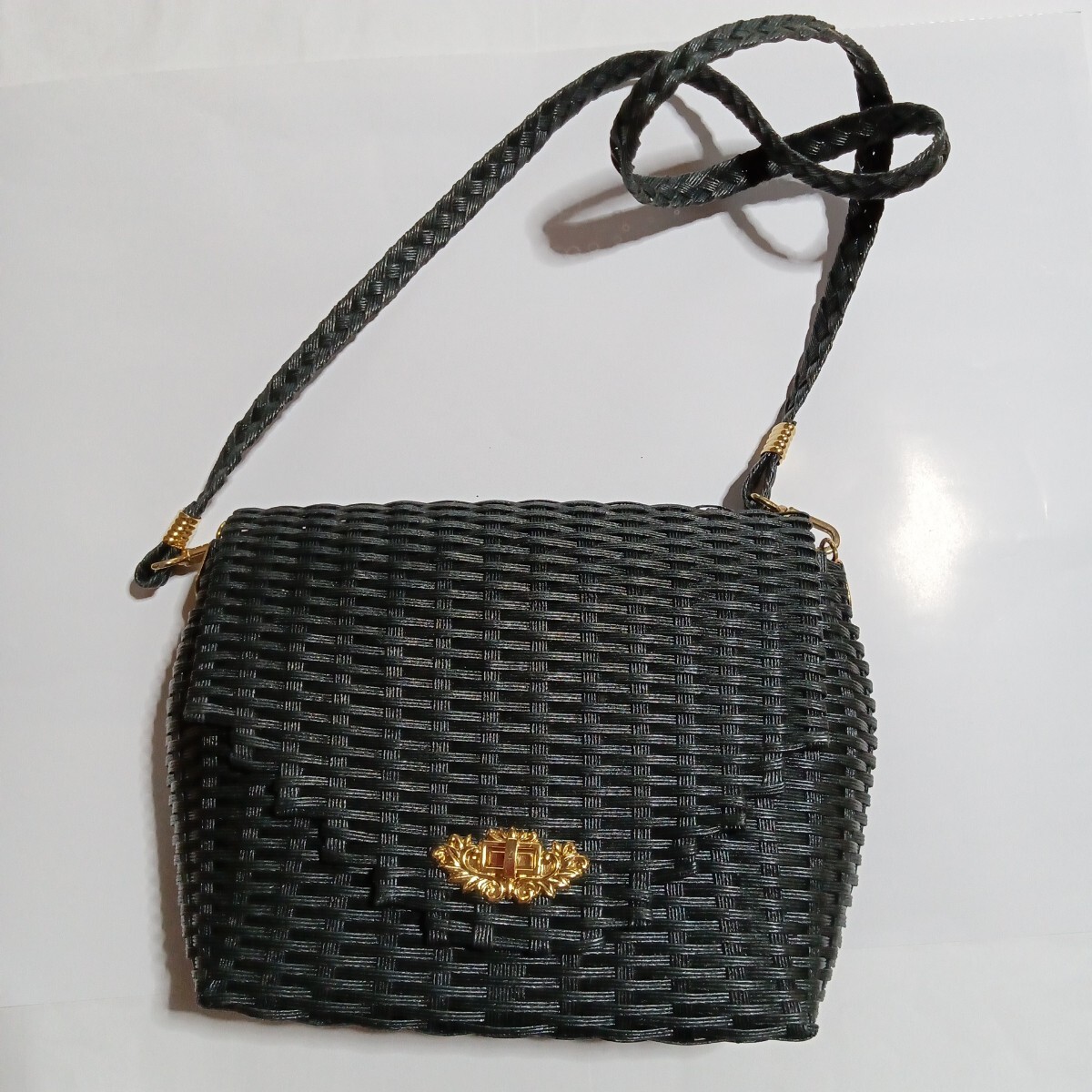 > ハンドメイドの素敵なエコクラフトバッグ ショルダーバッグ かごバッグ 作家作品 一点物 ブラック ハンドバッグ ハンドクラフト 贈り物