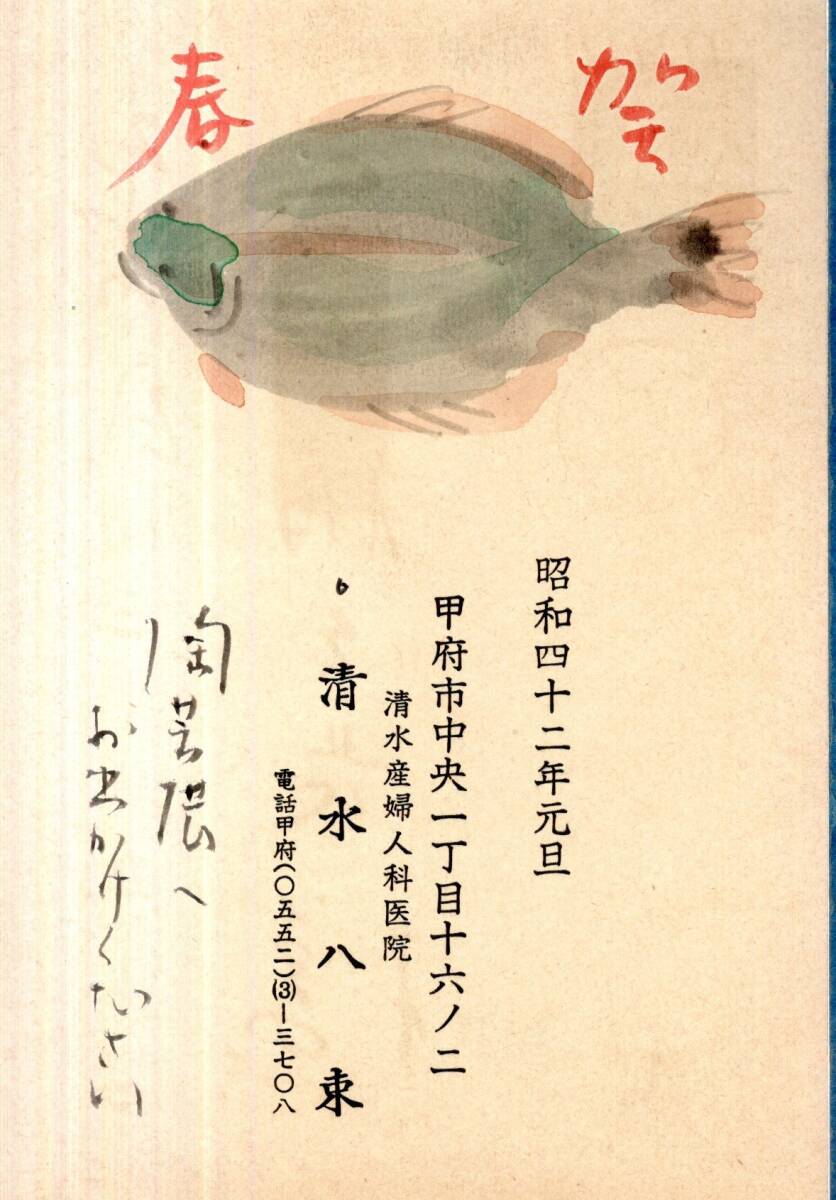 - 郵便はがき 昭和42年甲府市中央清水産婦人科医院清水八束氏(歌人でもあります)より市内武田某氏宛 エンタイア実逓便葉書