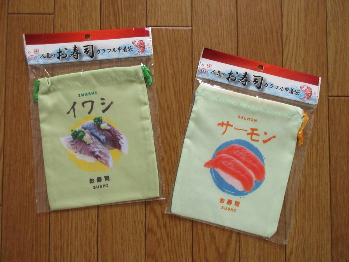 - お寿司柄 巾着 2枚セット (サーモン いわし) 巾着袋 寿司ネタ 寿司 握り寿司 スシ