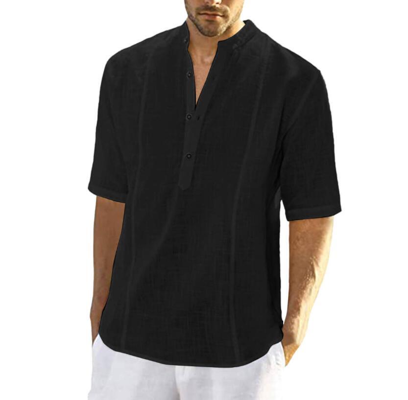 - S-3XLサイズ選択 / 夏物 半袖シャツ メンズ 5分袖 綿麻シャツ 麻シャツ コットンシャツ 開襟 カジュアルシャツ 涼しい 通気性 / ブラック