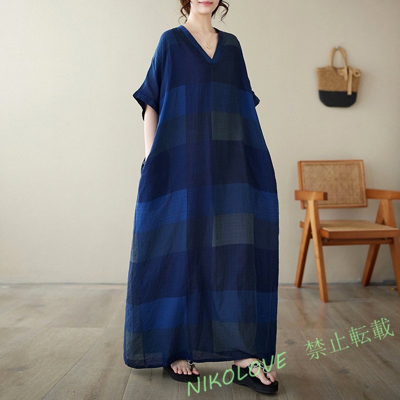 - 新品ゆったり大きいサイズ カジュアル Vネック 縞模様の格子 半袖 ロングスカート ワンピース 紺 LE547