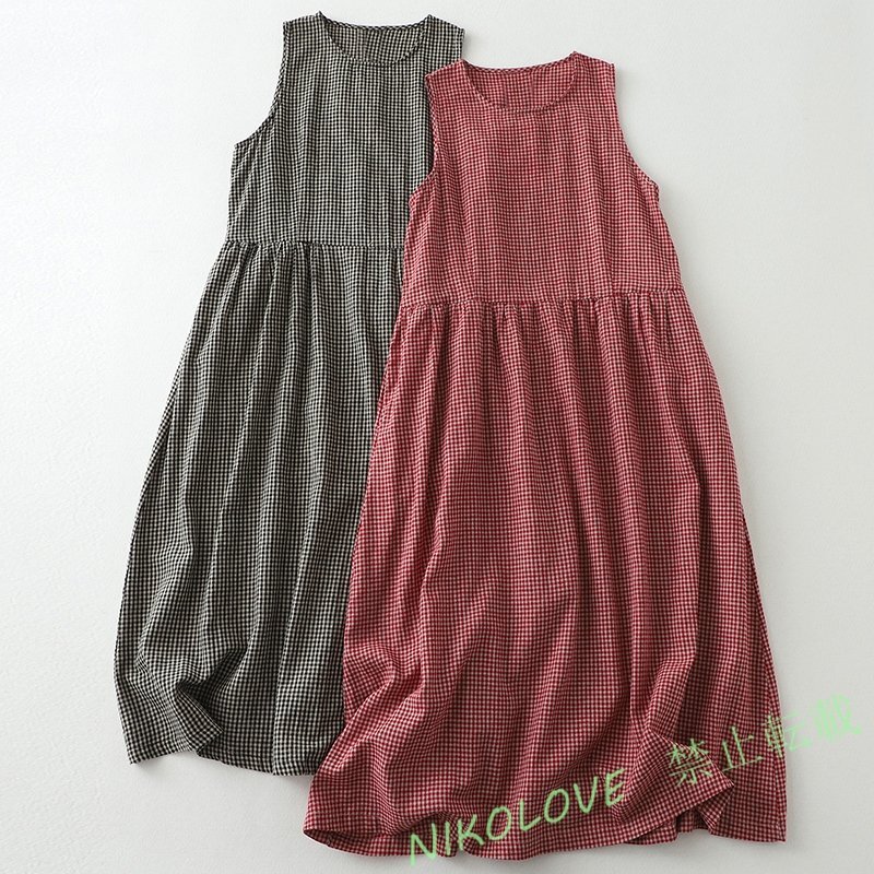 - 新品レディース カジュアル 大きいサイズ 体型カバー 細チェック柄 綿麻 袖なしロングワンピース 黒 M~2XL LE514