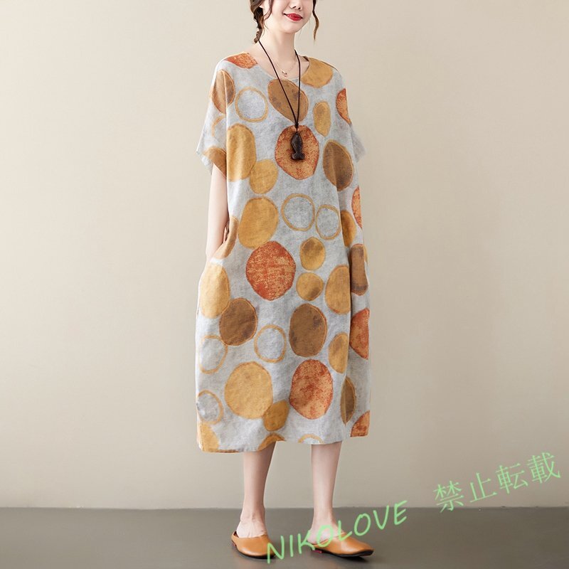 - 新品レディース カジュアル ナチュラル 復古 綿麻 ゆったり プリント柄 半袖 ロングワンピース イエロー LE945