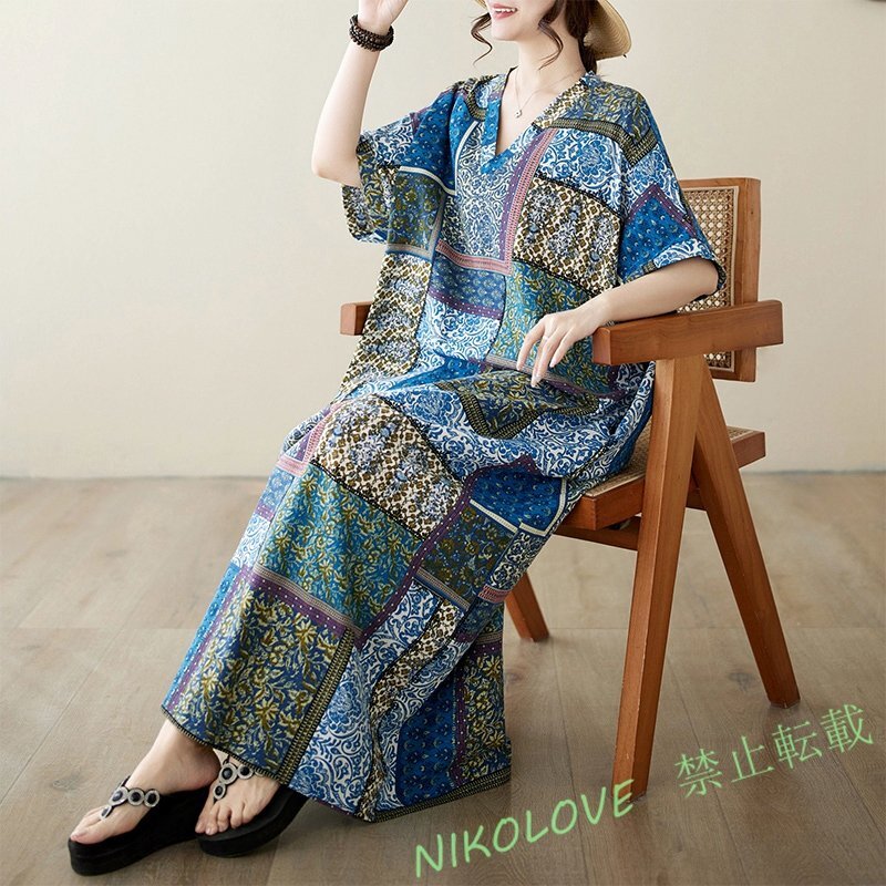 - 新品ゆったり大きいサイズ カジュアル Vネック 不規則幾何柄 レトロ 半袖 ロングスカート ワンピース 青系統 LE860