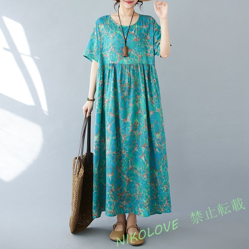 > 新品カジュアル オシャレ ゆったり大きいサイズ 体型カバー ドット柄 プリント 半袖 ロングワンピース F 紺 LE926