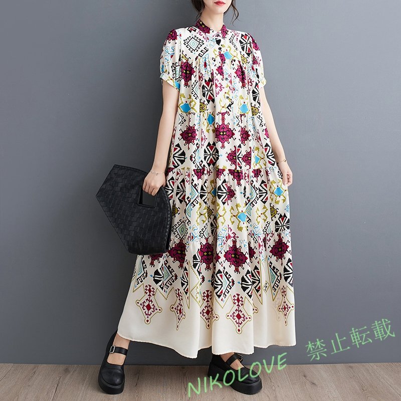 - 新品カジュアル 体型カバー レディース ゆったり大きいサイズ エスニックプリント 半袖 ロングワンピース 白 LH402