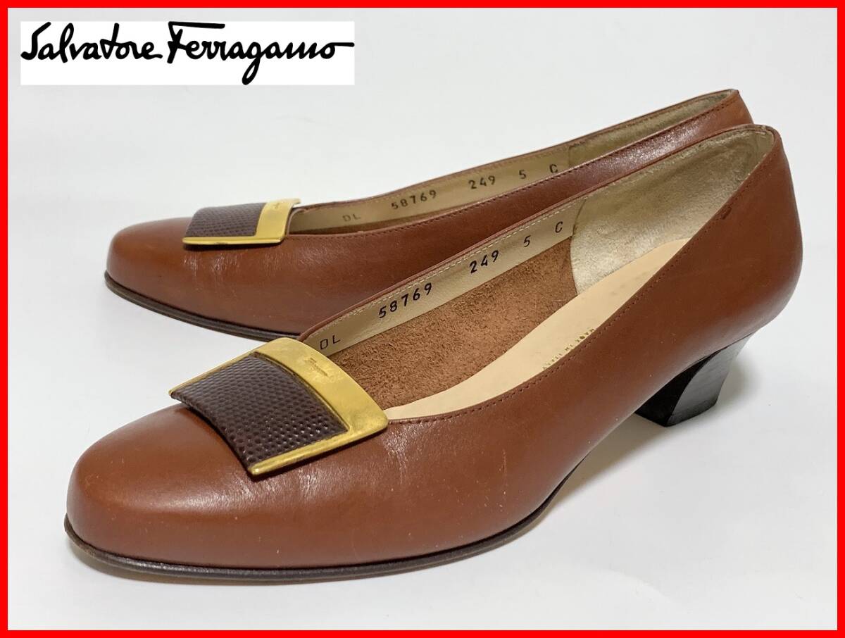 - 即決 Salvatore Ferragamo フェラガモ 5≒22cm パンプス 茶 ブラウン レザー レディース D2