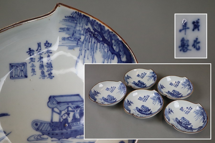 > 中国古玩 染付 船人物 桃形 皿 5枚 成化年製 唐物 時代物 細密細工 古美術品[c673]