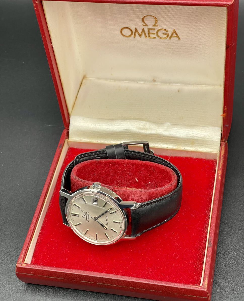 - 美品 OMEGA オメガ ジュネーブ cal1012 デイト 腕時計 自動巻き メンズ シルバー文字盤 純正尾錠 箱付き メンテナンス要