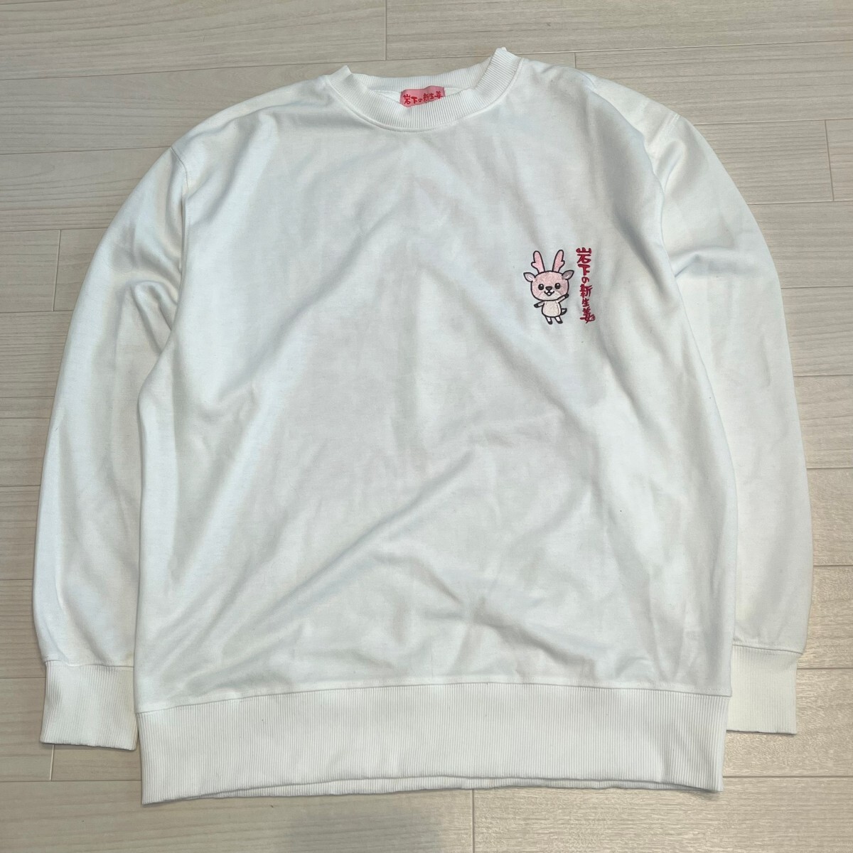 - 岩下の新生姜 イワシタノシンショウガ 背面プリント 前面キャラクター刺繍 トレーナー イワシカ ホワイト サイズL スウェット