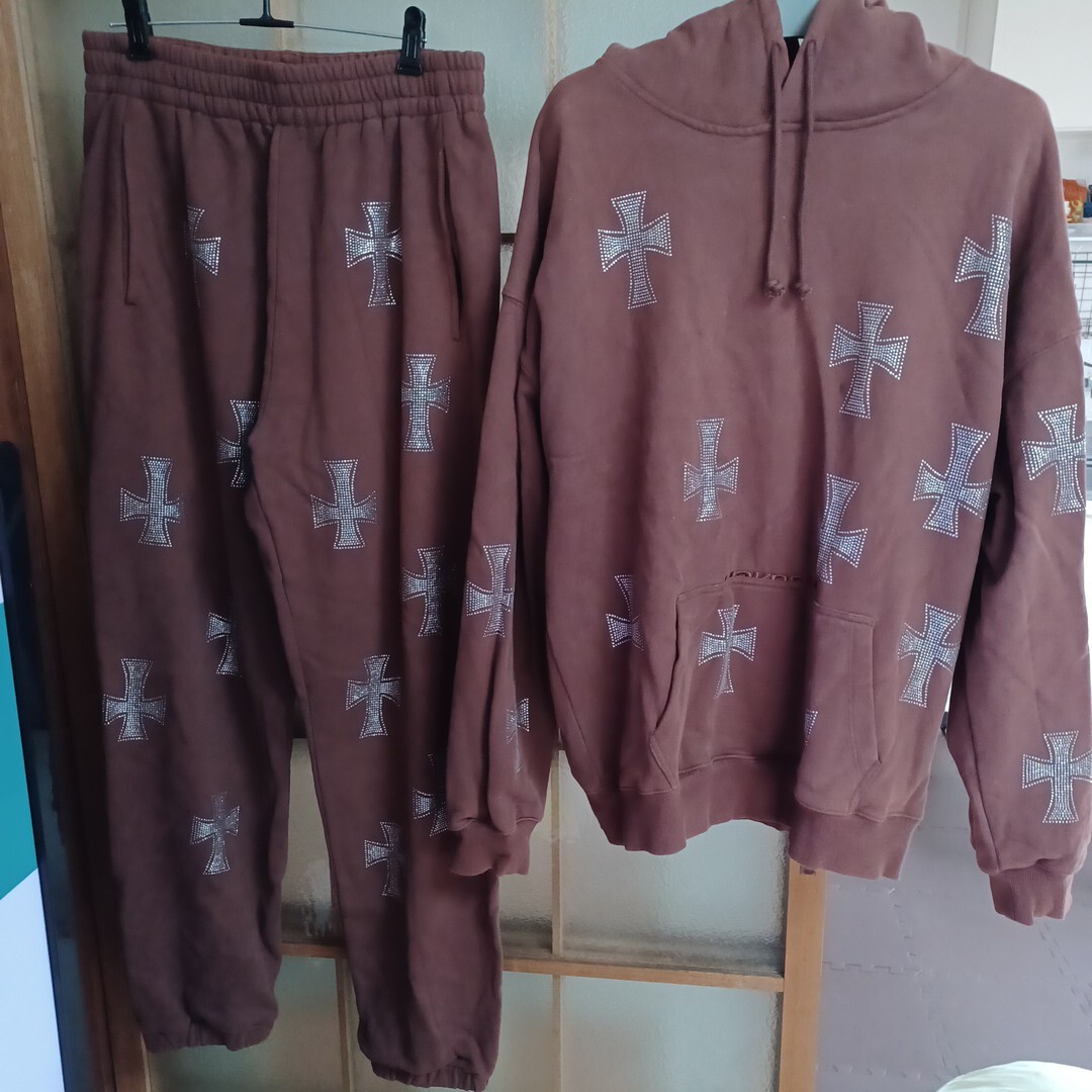 - アンノウンunknown十字架クロス総柄ラインストーン上下セットアップ プルオーバーフーディXLスウェットパンツLサイズ
