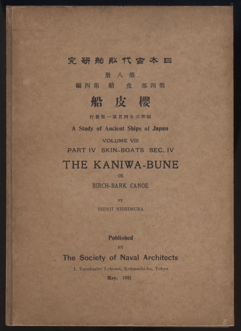 - 日本古代船舶研究 第八冊 第四部 皮船(かにわぶね) 第四編 櫻皮船 桜皮船 西村真次著 1931年 造船協会発行 検:バイダルカ シーカヤック