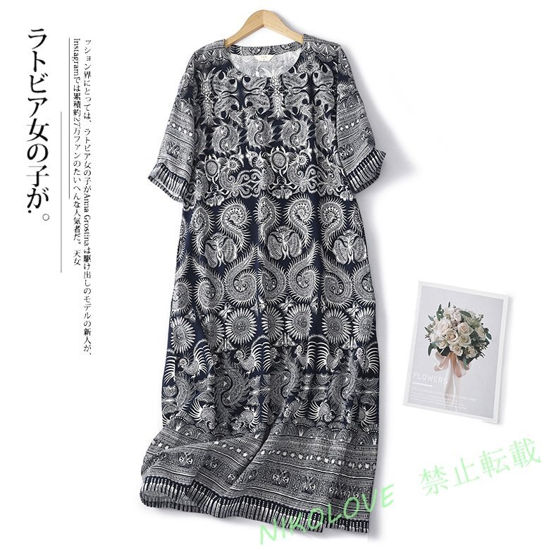 > 新品~ロングワンピース プリント柄 綿麻風 ロング丈 半袖 リネン混 マキシ丈 ゆったり 大きいサイズ 着やせ 旅行 キレイめ~M LD651