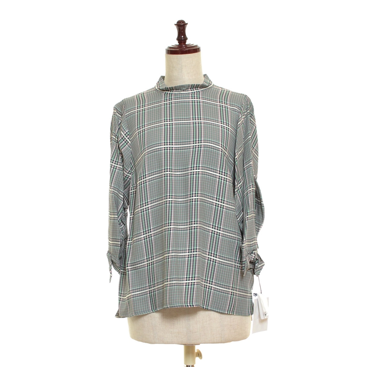 > □393785 未使用品 Akiki アキキ ◯プルオーバーカットソー ブラウス 七分袖 パフスリーブ 2019 レディース 日本製 グリーン チェック
