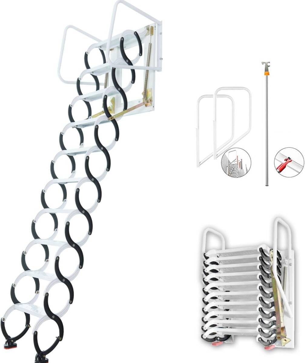 - ロフト階段 屋根裏伸縮はしご 折り畳みはしご 壁掛け 折りたたみ式 ロフトはしご プルダウン 金属 10個ステップ 手すり プルロッド付き 送