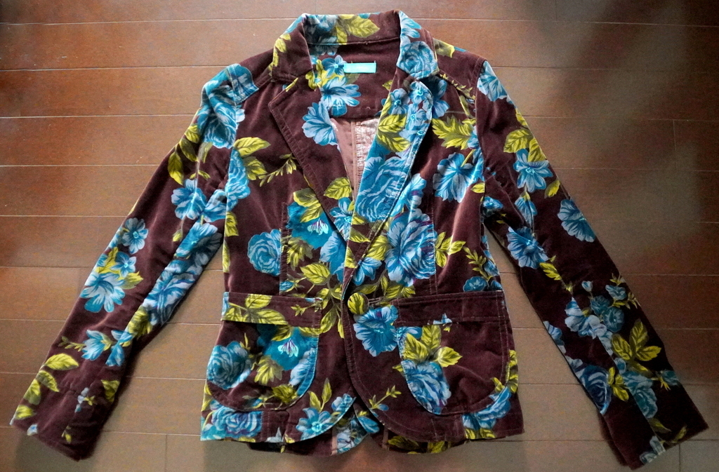 - ブラウンに青い薔薇の花柄 派手めジャケット ベロア調