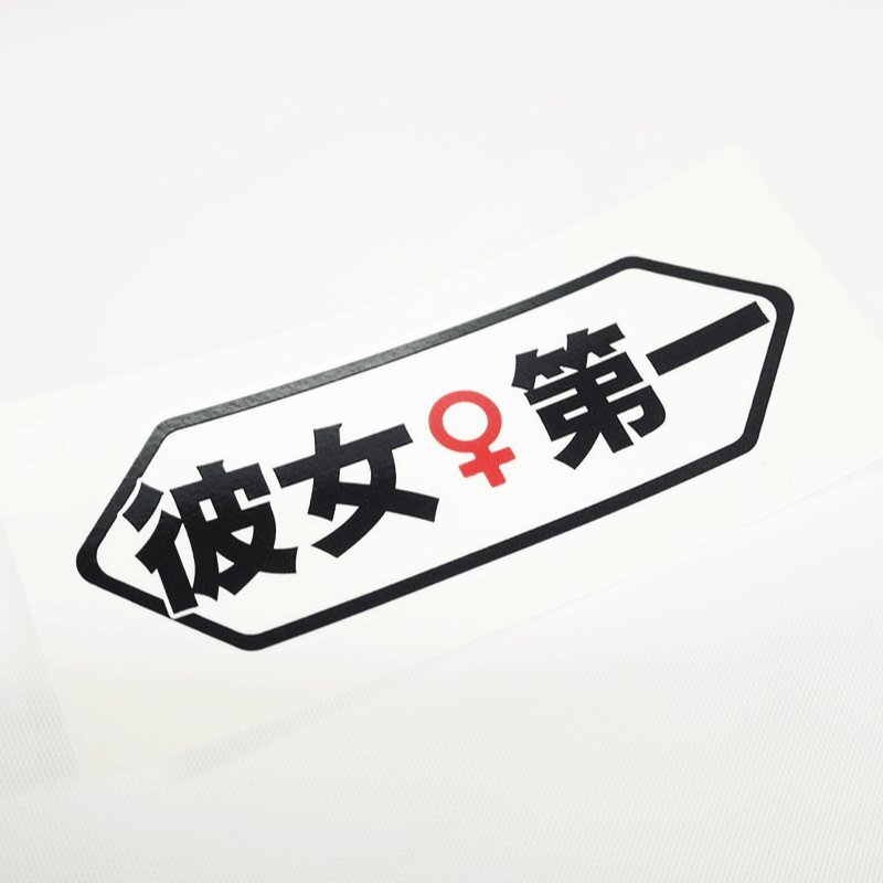 - おもしろステッカー 彼女第一 白×♀記号 赤 9.8cm 1枚 パロディ シール ヘルメット バイク デカール