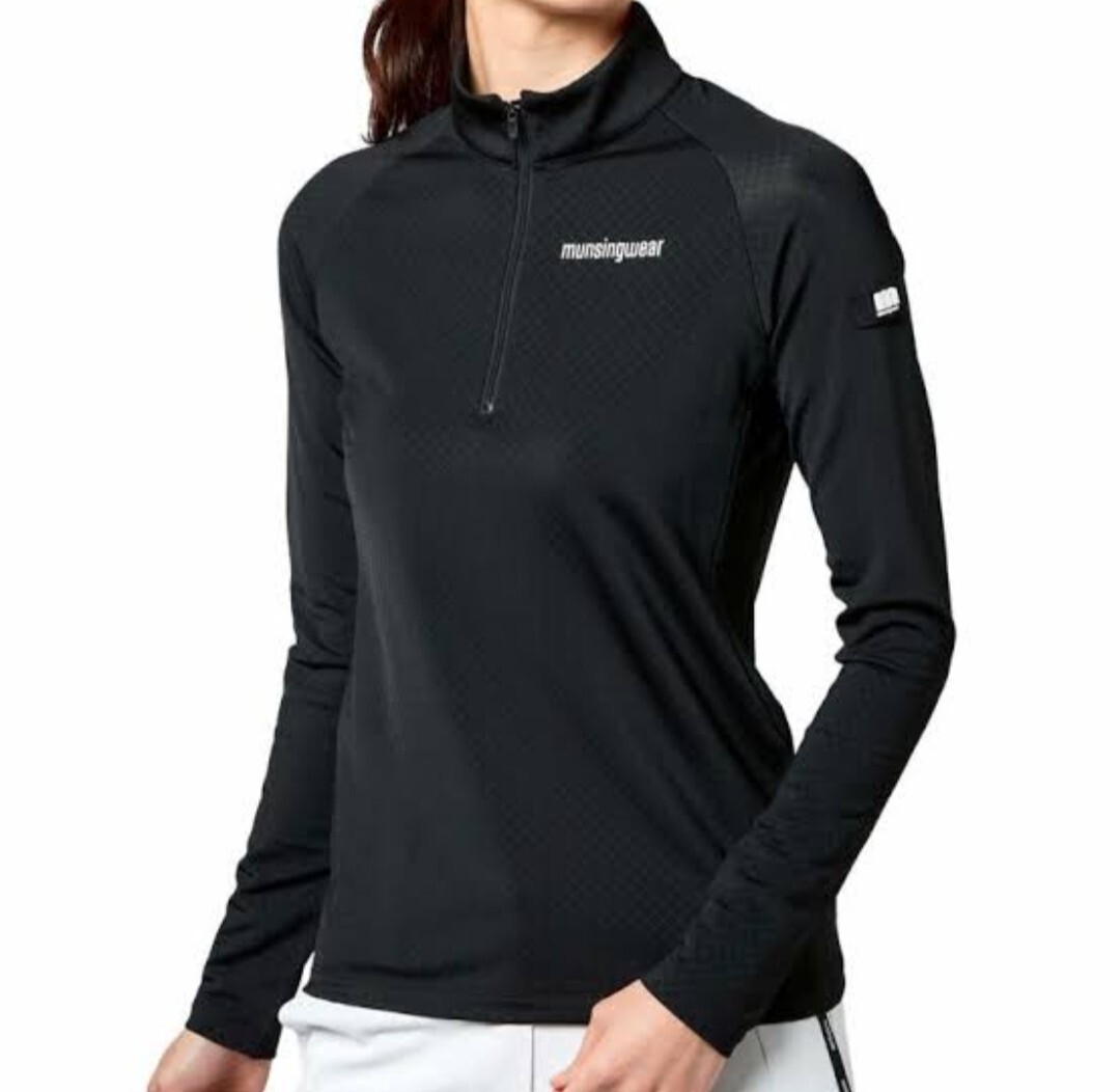 > マンシングウェア Munsingwear*レディースM*ダイヤチェック柄*ロゴプリント*ストレッチ*長袖ハーフジップ*美品*MEWUJB03*2022年モデル*黒