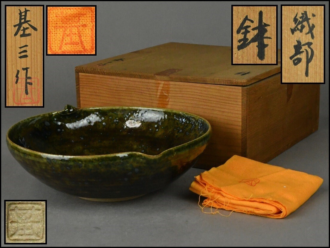 - 織部焼【基三作】鉢 共布 共箱 茶道具 UM24-0612