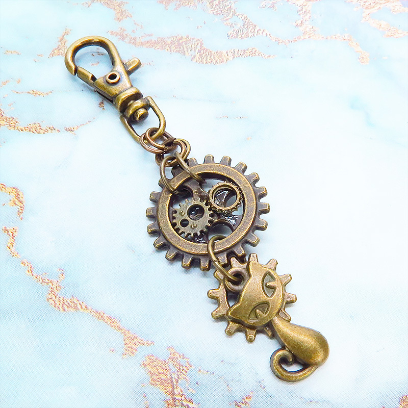 - アンティークゴールド 猫と歯車を組合せたスチームパンク風キーホルダー バッグチャーム ファスナーチャーム 金具変更可