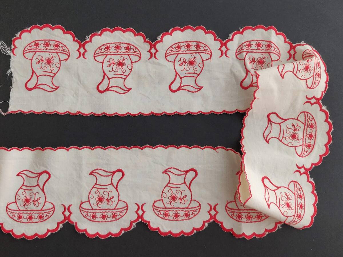 - 赤糸 ミシン刺繍 ピッチャー 洗面器 水差し トワレ フランス ヴィンテージ アンティーク 花柄 陶器 食器 古道具 蚤の市 雑貨