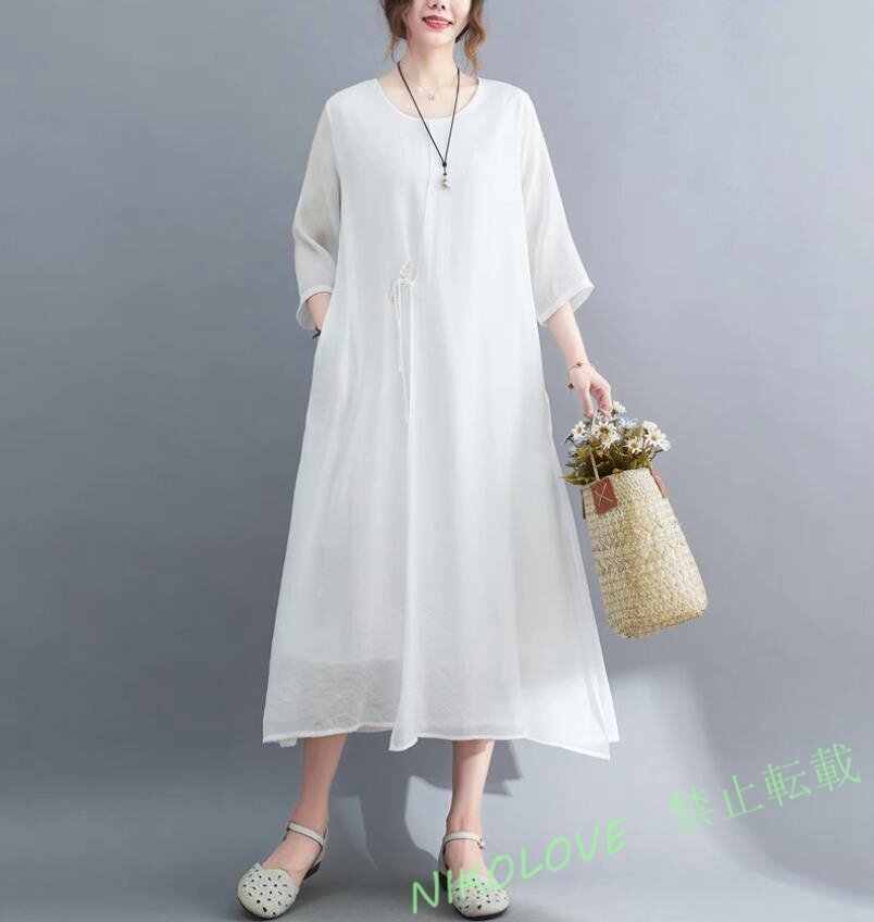 - 新品春夏ワンピース ミモレ丈 半袖 きれいめ ゆったり ロングワンピース aライン 可愛い 通勤 着痩せ 上品 涼しい ホワイト LH938