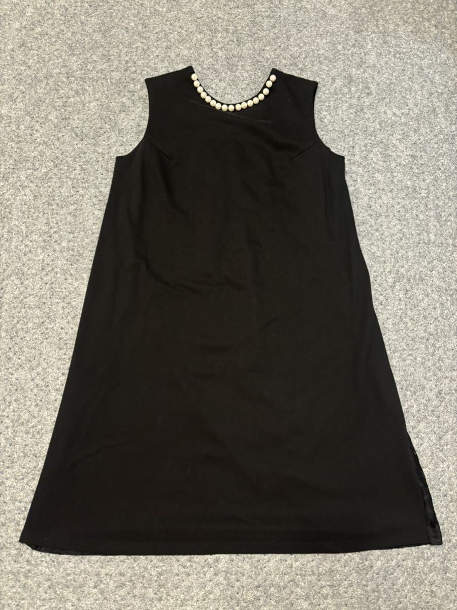 - ノースリーブワンピースドレス プルオーバー 背面レース膝丈ジャンパースカート パールビジューネックレス風 黒ブラック 結婚式パーティー