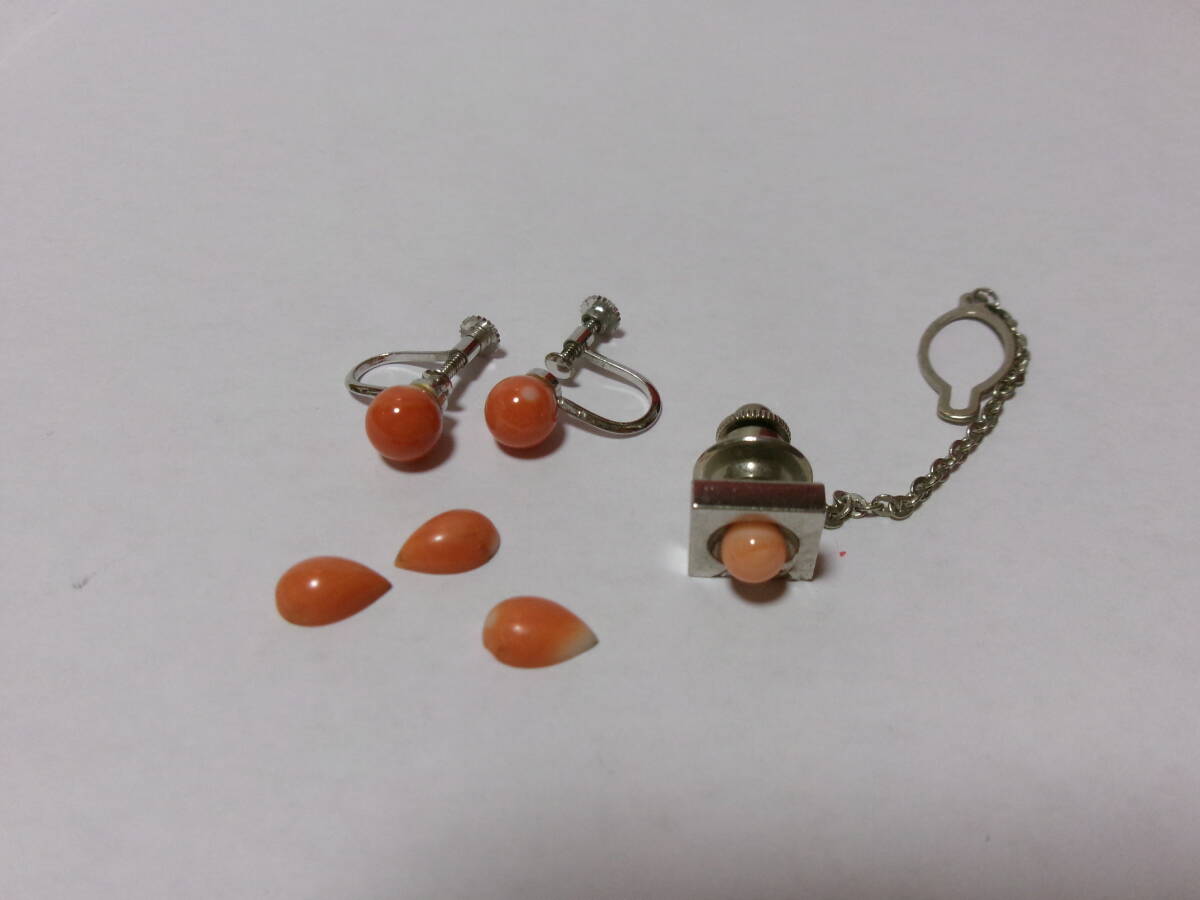- 沖縄 珊瑚 サンゴ イヤリング ネクタイピン 粒 3種類セット