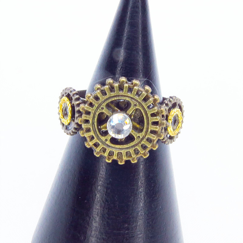 - アンティクゴールドリング ラインストーンに歯車を組合せたスチームパンク風リング 指輪 フリーサイズ