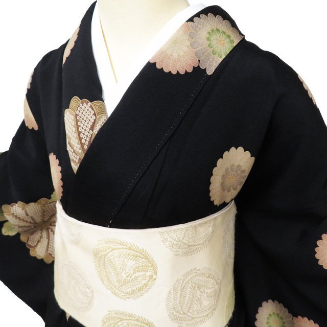 > 特選 小紋 着物 中古 正絹 袷 カジュアル 縮緬地 ちりめん 花模様 菊 黒色 多色 身丈163cm 裄68cm L きもの北條 A1057-5