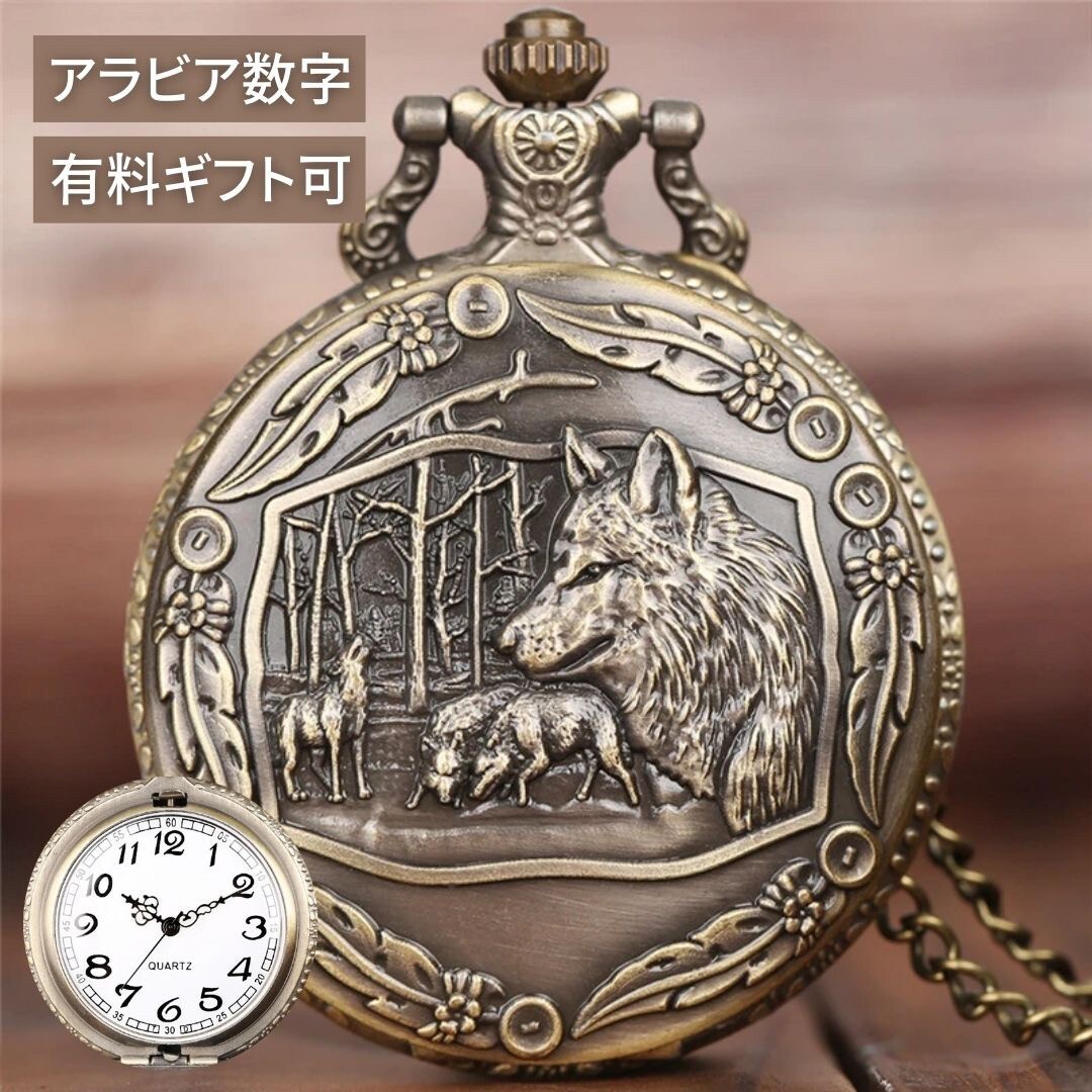 - 懐中時計 狼 オオカミ ブロンズ アンティーク チェーン付き 高耐久性 文字盤 メンズ レディース ユニセックス レトロ クラシック