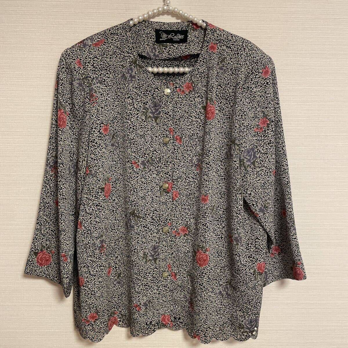 - 婦人服 レトロ シャツ 花柄 七分袖 F フリーサイズ 肩パット入り 美品
