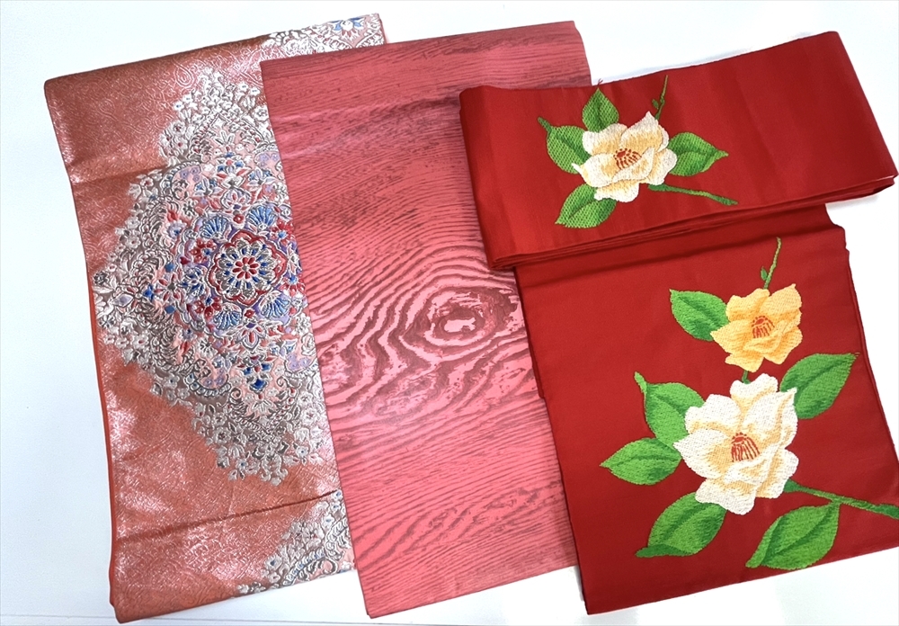 - 花とら●リサイクル帯 袋帯 名古屋帯 付け帯 3本まとめて 絹 金属糸 未使用品含む 木目風 アラベスク調 240708