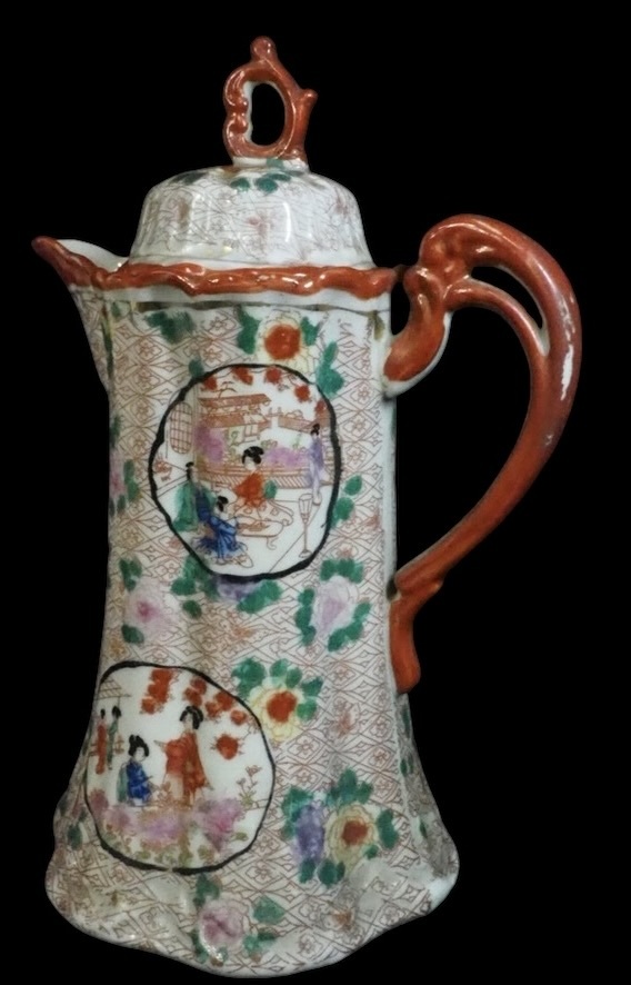 - 色鮮やかで華やかな上絵付け!明治期ビンテージ 国産黎明期 古瀬戸「海外輸出用アンティークティーポット」 手描き 陶磁器 1890年代 KYI607