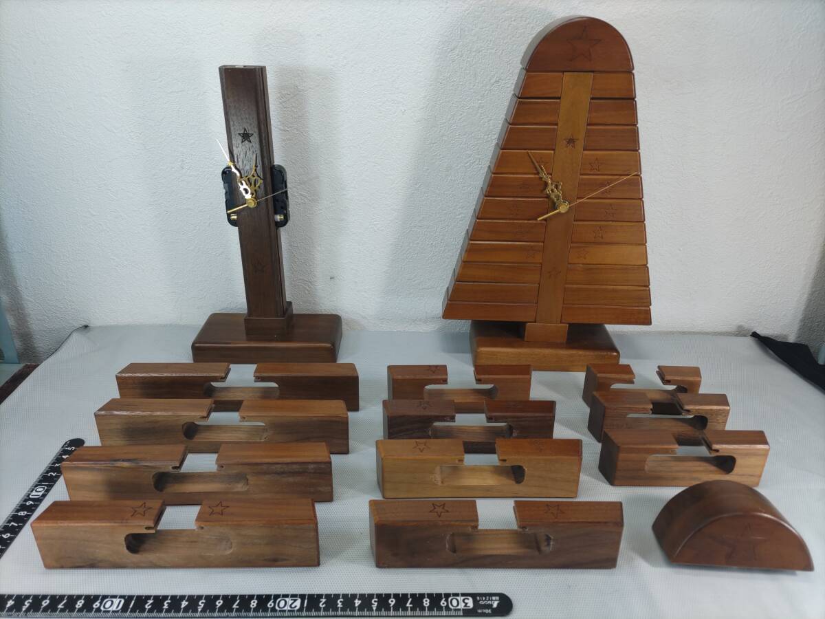 > ■送料無料!■まとめて■ツリー型木製置時計・H31cm■ブロック型■WOOD CRAFT■家具・木工の町、旭川発・特別製作品■2点セット!