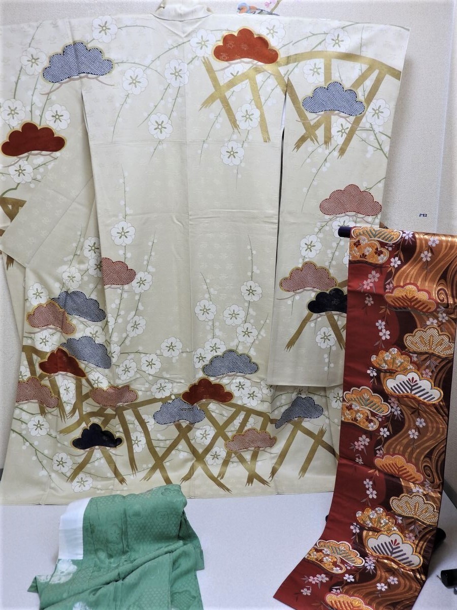 - Club藤★振袖 本加工 松梅模様 3点セット 御仕立上(3081)
