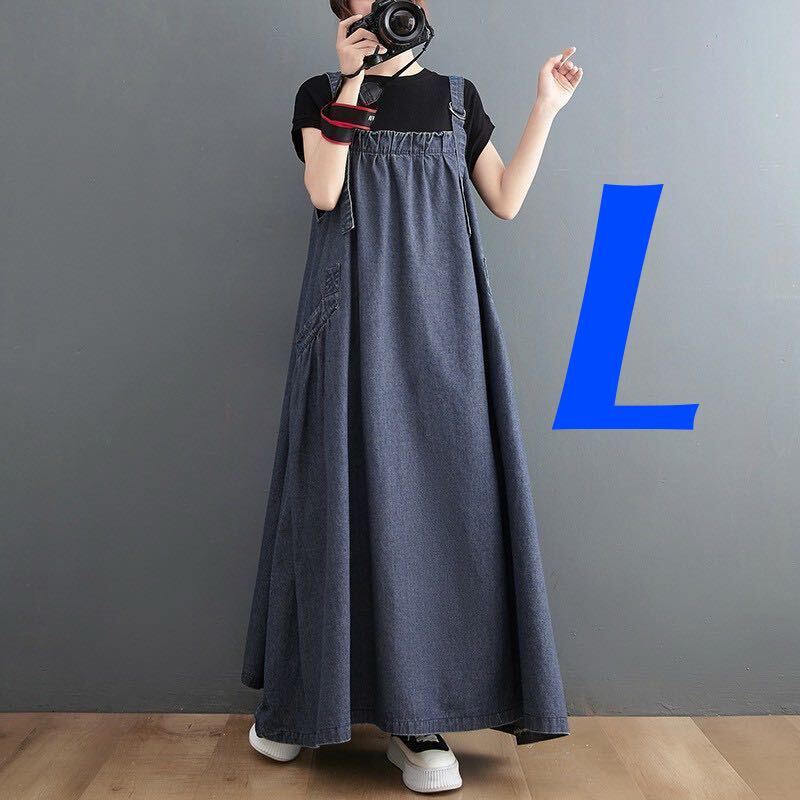 - ロングワンピース ワイド サロペット ロングスカート デニム ワンピース オーバーオール 体型カバー 紺色 ネイビー Lサイズ
