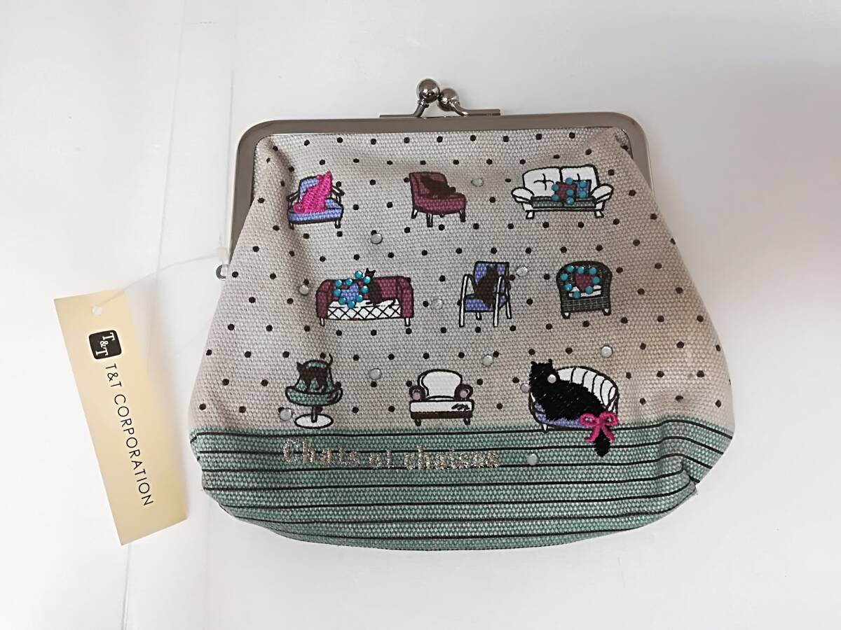 - ■未使用 T&Tコーポレーション ネコ チェア ソファー柄 ラインストーン付き がま口 ポーチ 紙タグ付き