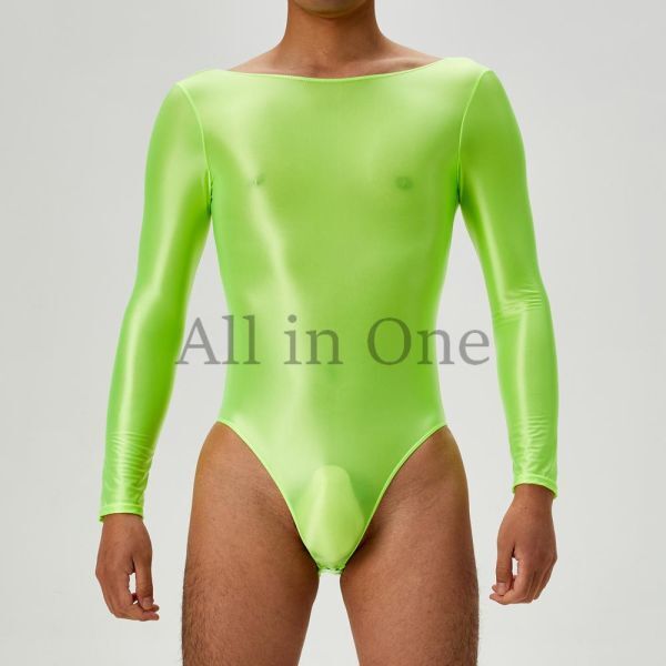 > 135-144-26 ツヤツヤ 光沢 シルキー ハイレグ ロングスリーブ【グリーン,M】男性 メンズ コスチューム セクシー コスプレ ランジェリー.1