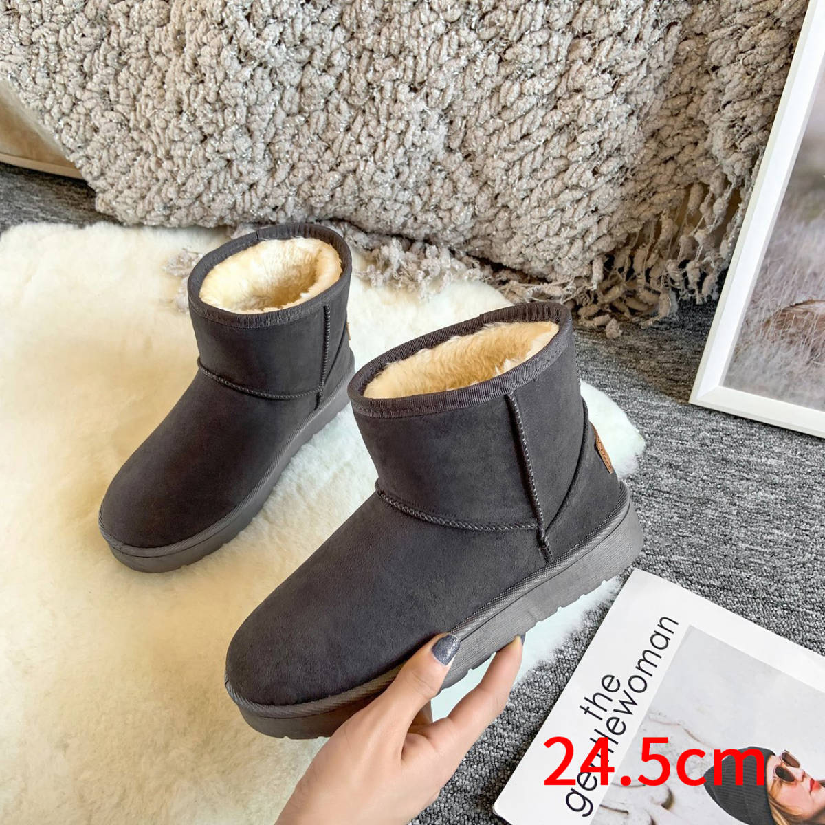 - レディース ムートンブーツ ショートブーツ 冬靴 シューズ 裏起毛 防寒 濃密毛 グレー 24.5cm